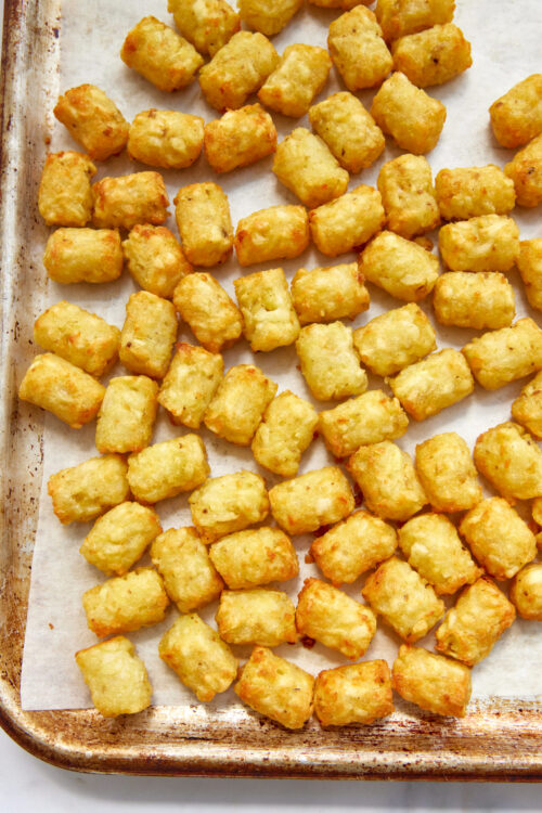 - Bake the Tater Tots for 20-30 minutes until crispy and golden.