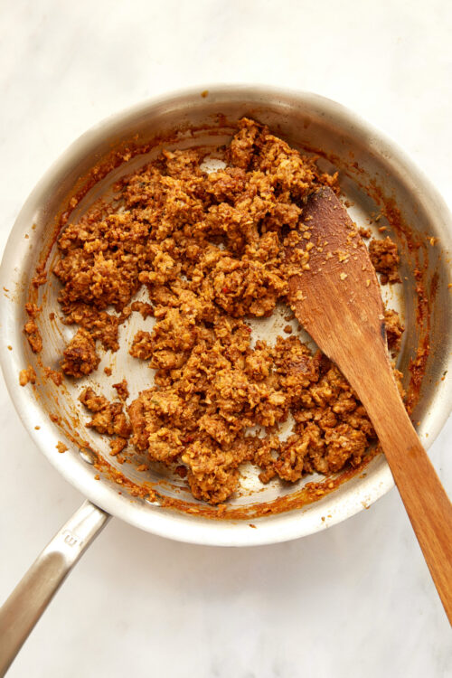 - In a skillet over medium heat, cook the ground beef until browned, breaking it up as it cooks. Drain any excess fat, then stir in the taco seasoning and water. Let it simmer for 5-6 minutes until the flavors blend.