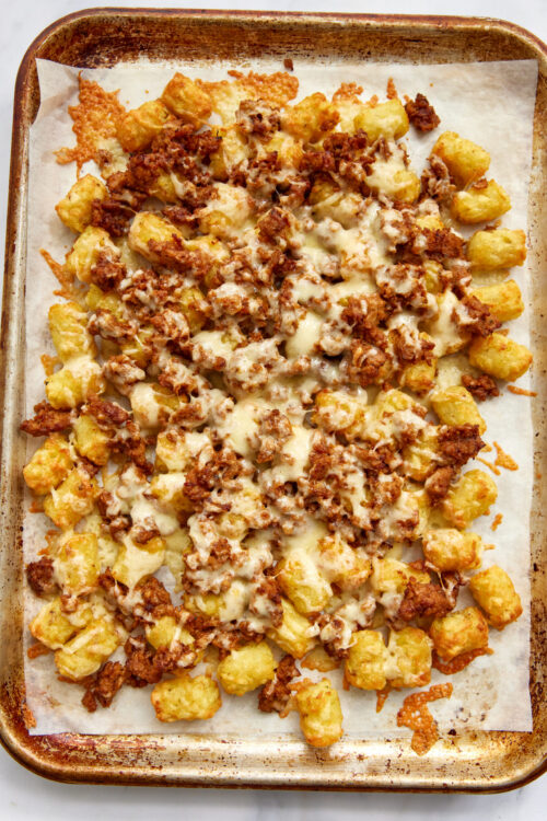 We love this totchos recipe with the taco meat and melted cheddar, but you can customize totchos in all sorts of ways. Perhaps you’re trying to cut down on red meat but still crave totchos. Replace the ground beef with browned ground chicken, turkey, or pork; you can even use shredded or pulled chicken or pork. Or maybe you want to up your red meat game and please the steak and potato lovers in your house? Try topping totchos with bite-sized pieces of leftover steak (or cook up a fresh one). Want to keep totchos vegetarian? That’s easy! Just replace the taco meat with seasoned black or pinto beans.