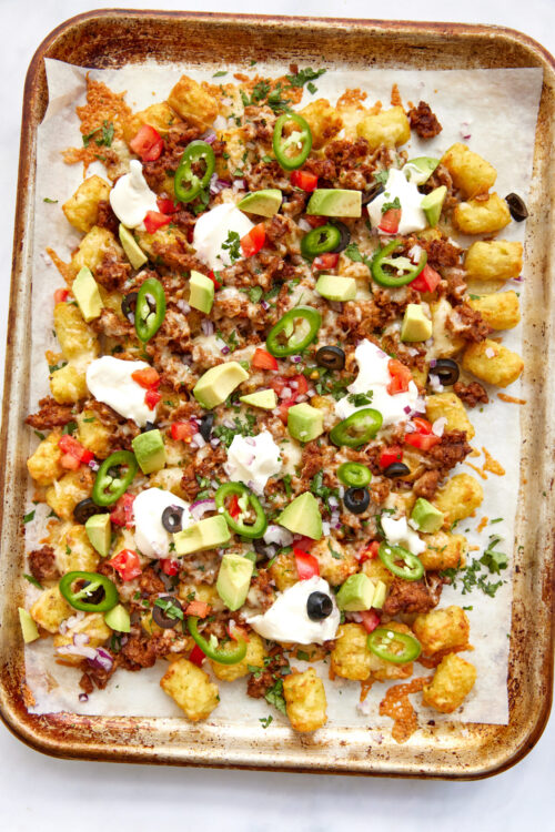 Totchos are best eaten right away; that said, while they will last up to 3 days in an airtight container in the refrigerator, the Tater Tots can get soggy and the fresh toppings limp. If you have leftovers and need to store them, here’s our advice: if possible, store the Tots, meat, and cheese in an airtight container and the toppings separately; then heat the totchos base in the oven or air fryer to crisp the spuds back up, and serve with your fresh toppings. We don’t recommend freezing totchos.