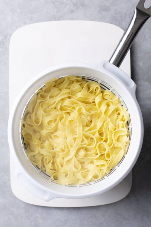 - Fill a large pot with 4 quarts of water, then stir in 1 tablespoon of salt and bring it to a boil. Once boiling, add the fettuccine and cook until it reaches al dente. Drain the pasta and set it aside.
