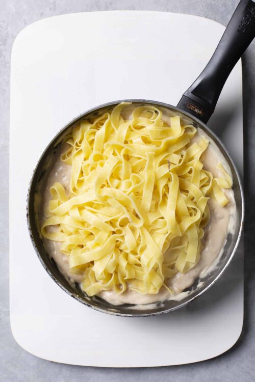- Once the sauce is heated through, toss in the cooked pasta until evenly coated.